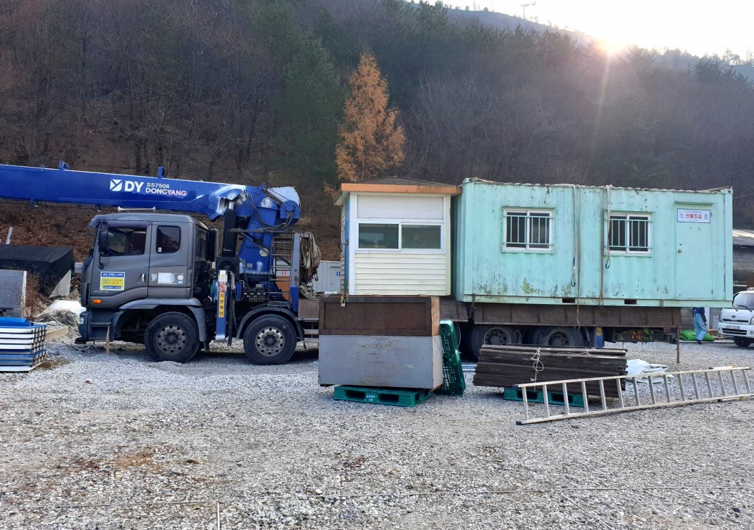 현장에서는 오래된 컨테이너와 현장 가설물들을 안전하게 옮겨야 했고,